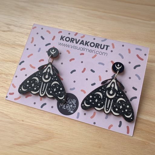 Visual MeriSuomalaisesta koivuvanerista valmistettu yöperhonen joka sopii monen asusteen kanssa hyvin yhteen. Näyttävän näköinen korvakoru joka tuntuu kuitenk...